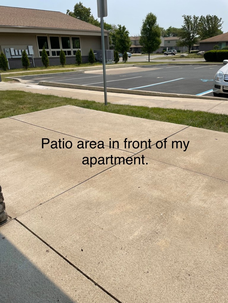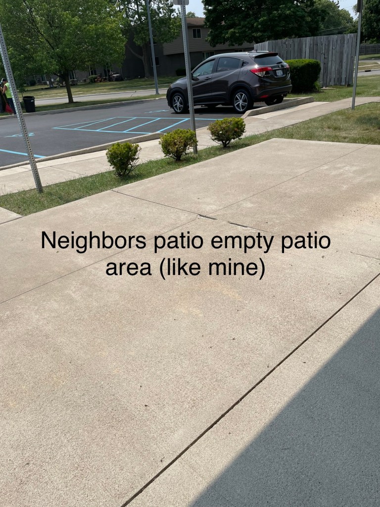 The supervisor had PLENTY and I mean P L E N T Y of room to park their golf cart to go in the randomly picked apartment which happens to be my neighbor, parks on the sidewalk blocks me from wheeling out. (2nd picture) what baffles me is that he couldn’t park in the empty patio spots but had to park the gulf cart on the sidewalk where we walk or wheel into our apartments or go out. 🤬 I had to wait until they were done before moving the golf cart so I can throw out my garbage. WHY?!?!?!