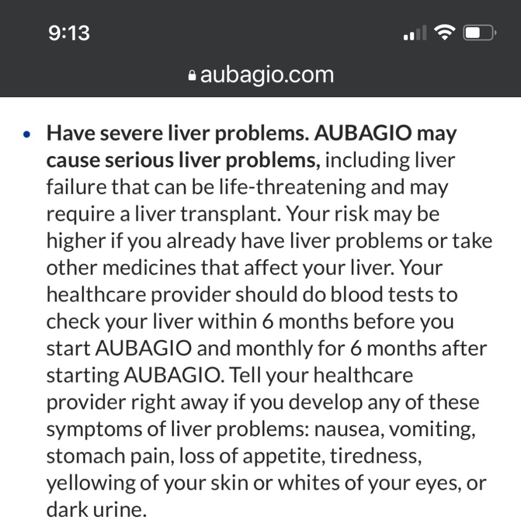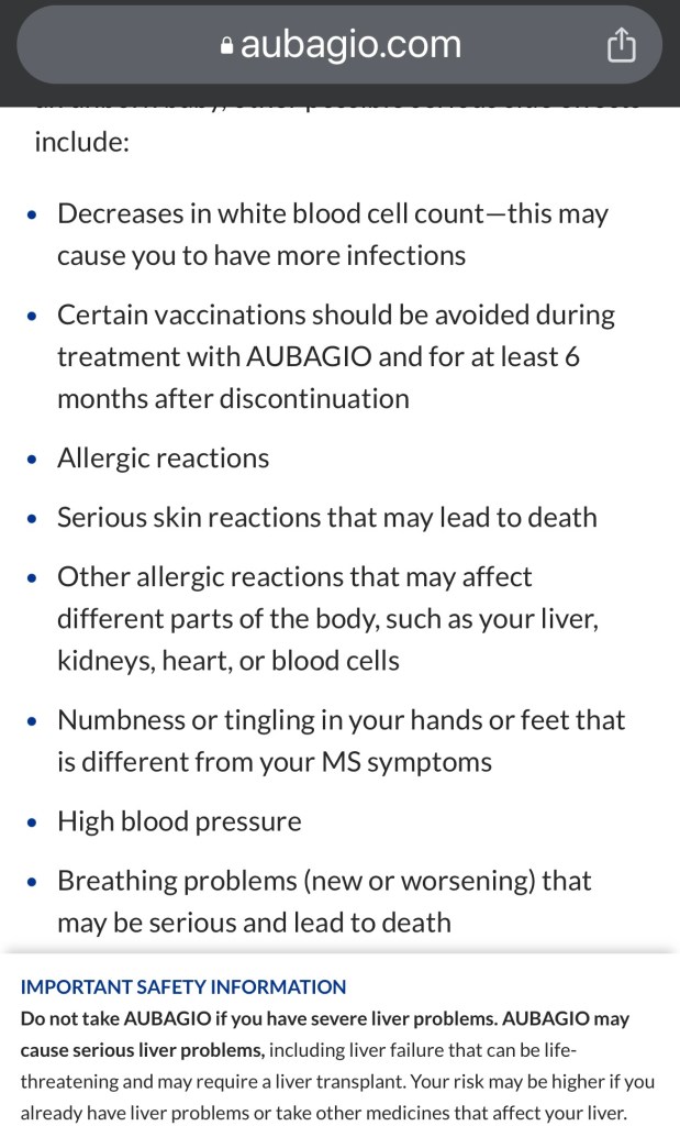 I met with my neuro team recently for the next 6-month checkup which now is the year anniversary of doing Kesimpta. I told the NP I am stopping the meds. The NP asked if I was willing to try different meds. I asked what kind of meds I should try, and it was suggested that I should try 2 other oral medications to help prolong the progression of the MS. One was called Aubagio and the other was called Vumerity. I did some research on the side effects and found this: Oh, I loved this comment, NOT, NP said “you MAY stop taking Kesimpta”. I’m like really? I may? Again, thinking, blow it out your ASS! I stopped myself and did not order any more in July. So, here are the side effects of the 2 meds suggested.