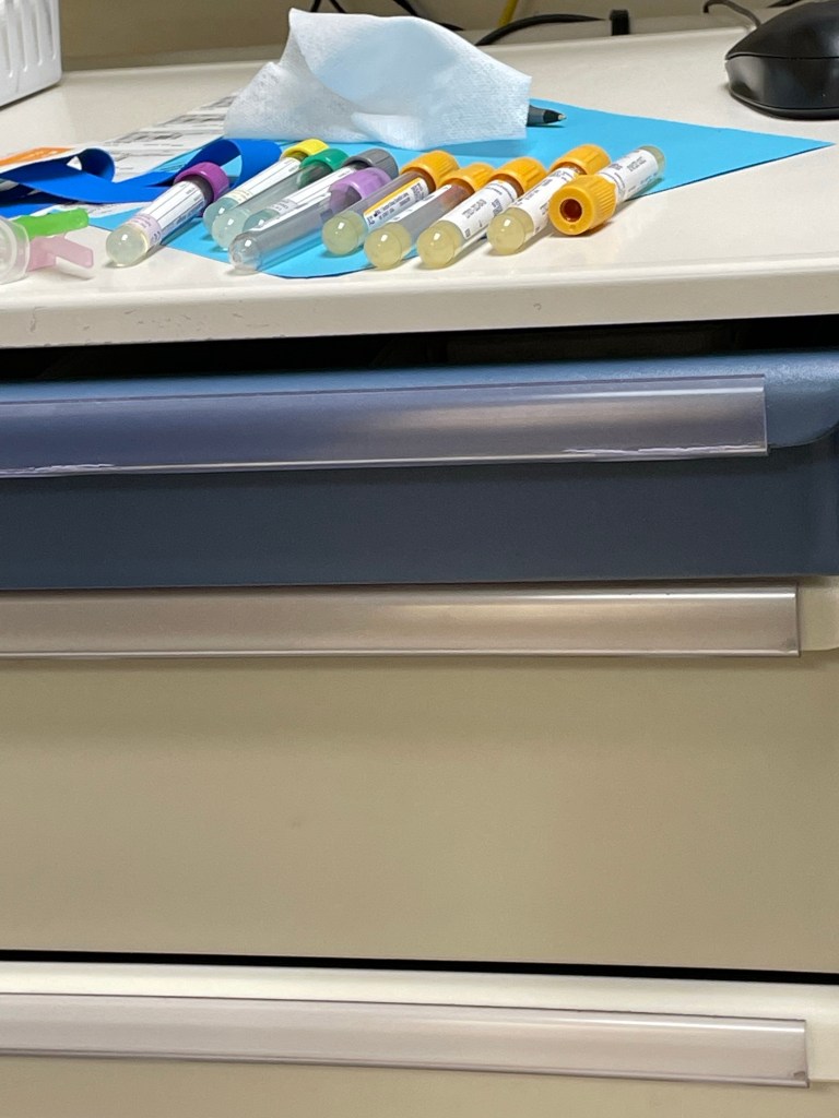 My number to be called for labs. “58” 5+8=13. (Remember yesterday’s post, I mentioned Lucky 13 because of my dad? Hmm wasn’t a great lucky 13). Geez, ten vials of blood needed. Guess I had plenty, no fainting here. I’m a toughie.