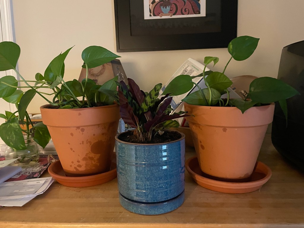 This morning I repotted some plants I’ve babied from cuttings into sprouting roots and now ready to plant. I repotted my tiny growing succulent that I bought last year that now has babies and my recently purchased Rattlesnake plant. When I opened the bag of potting soil this morning, ahh the scent of dirt just filled my happy brain hormones. There’s this sense of peace and happiness I feel when I’m working with dirt and plants. Happy Saturday in spite of the rain. 💚💛🧡