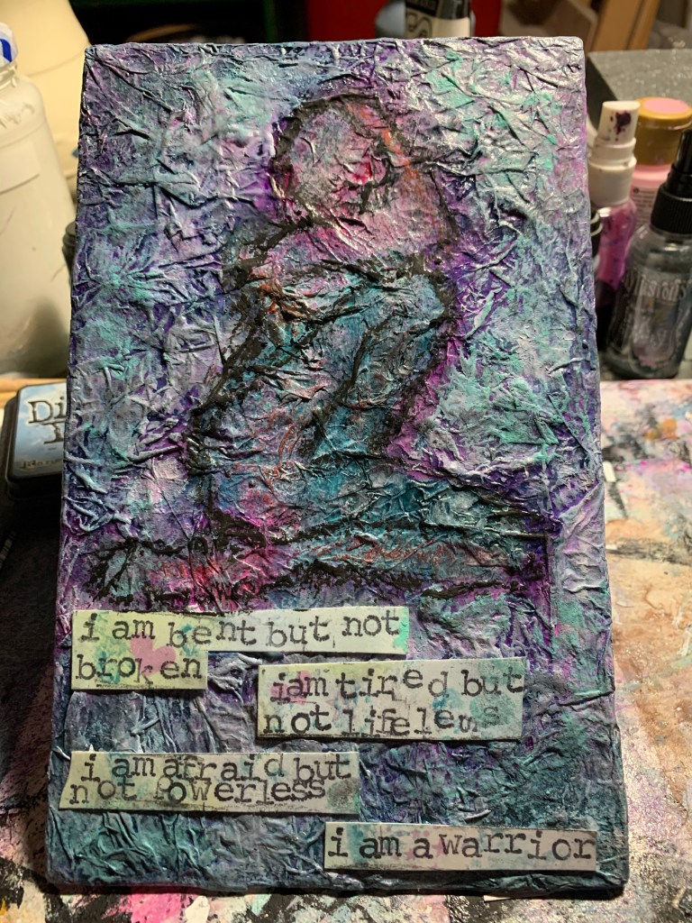 I made this one night struggling to sleep. The pinkish red resembles the throbs, pinches, electric shocks I feel. Tissue paper crumbled up resembles nerves always on alert waiting for the surprise from something related to MS.